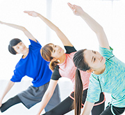 ヨガマットを敷き、インストラクター指導のもとストレッチ~筋力トレーニングまで幅広い運動をします。